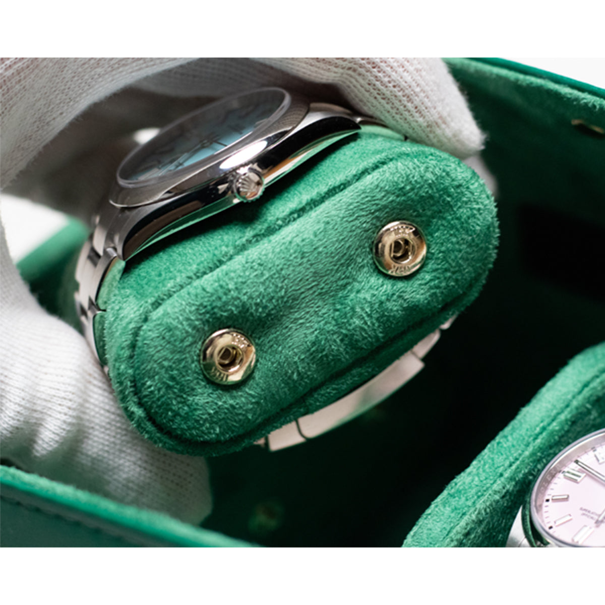 This GTP 2-Way watch roll is designed to fit two watches in it's stunning Deep Sea Blue. All cushions use an easy snap button system which makes it effortless to store your watch in the roll. The 2-Way watch roll is a perfect tool to showcase and protect your beloved watches in an elegant way.
