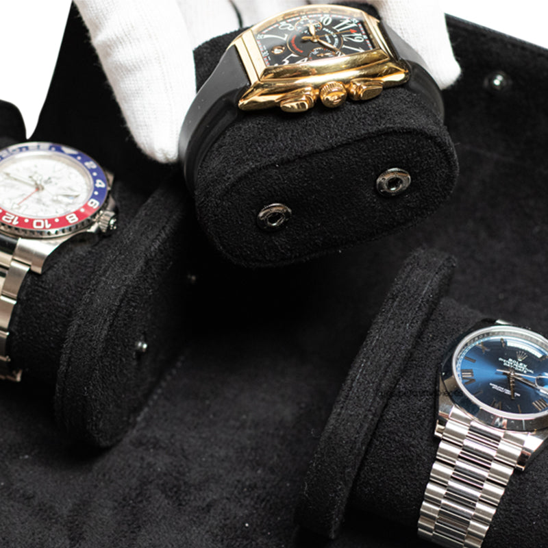 This GTP 3-Some watch roll is designed to fit three watches. All cushions use an easy snap button system which makes it effortless to store your watch in the roll. The 3-Some watch roll is a perfect tool to showcase and protect your beloved watches in an elegant way.