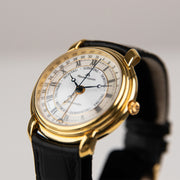 Ein einzigartiges Merkmal des Ziffernblatts ist der Perlmuttring, auf dem die römischen Ziffern kunstvoll platziert sind. Diese besondere Gestaltung verleiht der Uhr einen unvergleichlichen Charme und eine unwiderstehliche Eleganz. Die feinen Zeiger, jeder mit einer individuellen Farbgebung, setzen Akzente und betonen die Exklusivität dieser Uhr.