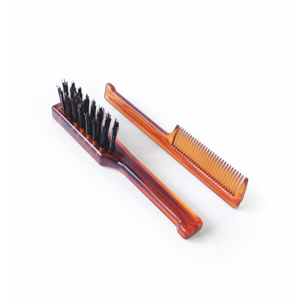 Das Set besteht aus einer Bürste und einem Kamm für die professionelle Pflege von Bart und Schnurrbart.