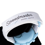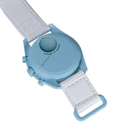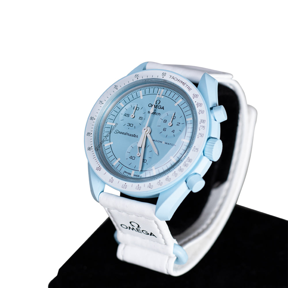 Bei dieser Mission treffen ein luftiges Pastellblau und ein strahlend weißes VELCRO©-Armband aufeinander. Der Sekundenzeiger des Chronographen, die Zeiger der Totalisatoren und die Tachymeterskala sind ebenfalls in Weiß gehalten. Die Zifferblätter sind mit dem OMEGA X SWATCH Branding, sowie dem legendären Speedmaster Logo und dem neuen MoonSwatch Logo versehen. Alle Modelle bieten folgende Features, die für eine ausgeprägte Liebe zum Detail stehen: die Glaskonstruktion mit dem kaum sichtbaren „S“ in der Mitte des Glaskörpers, das edle und raffinierte, kreisförmige Muster auf dem äußeren Ring des Zifferblatts und den Totalisatoren, die kantig-fließende Konstruktion der Bandanstöße, den legendären „Punkt über der Neunzig“ auf der Tachymeterskala der Lünette und natürlich die einzigartige Bioceramic-Optik und -Haptik. Sämtliche Stunden-, Minuten- und Sekundenzeiger des Chronographen sowie die Stundenmarkierungen sind mit Superluminova versehen und leuchten perfekt im Dunkeln.